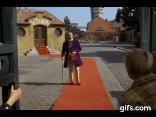 When I make my first entrance, I'd like to come out of the door carrying a cane and then walk toward the crowd with a limp. After the crowd sees Willy Wonka is a cripple, they all whisper to themselves and then become deathly quiet. As I walk toward them, my cane sinks into one of the cobblestones I'm walking on and stands straight up, by itself; but I keep on walking, until I realize that I no longer have my cane. I start to fall forward, and just before I hit the ground, I do a beautiful forward somersault and bounce back up, to great applause.