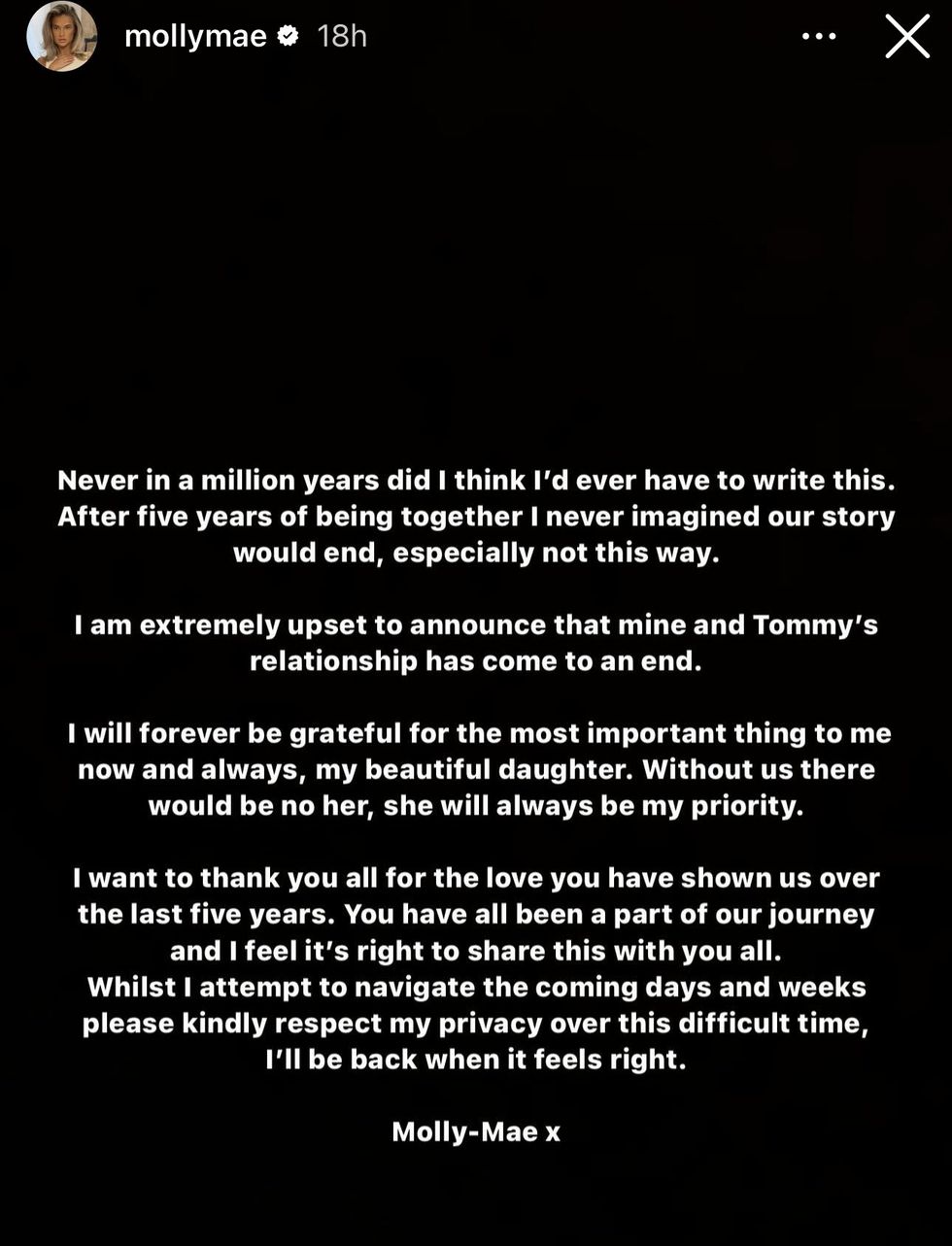 In a heartbreaking statement posted on her Instagram Story, Molly said she "never in a million years" thought she'd have to deliver the personal announcement. "I am extremely upset to announce that mine and Tommy's relationship has come to an end," she added.