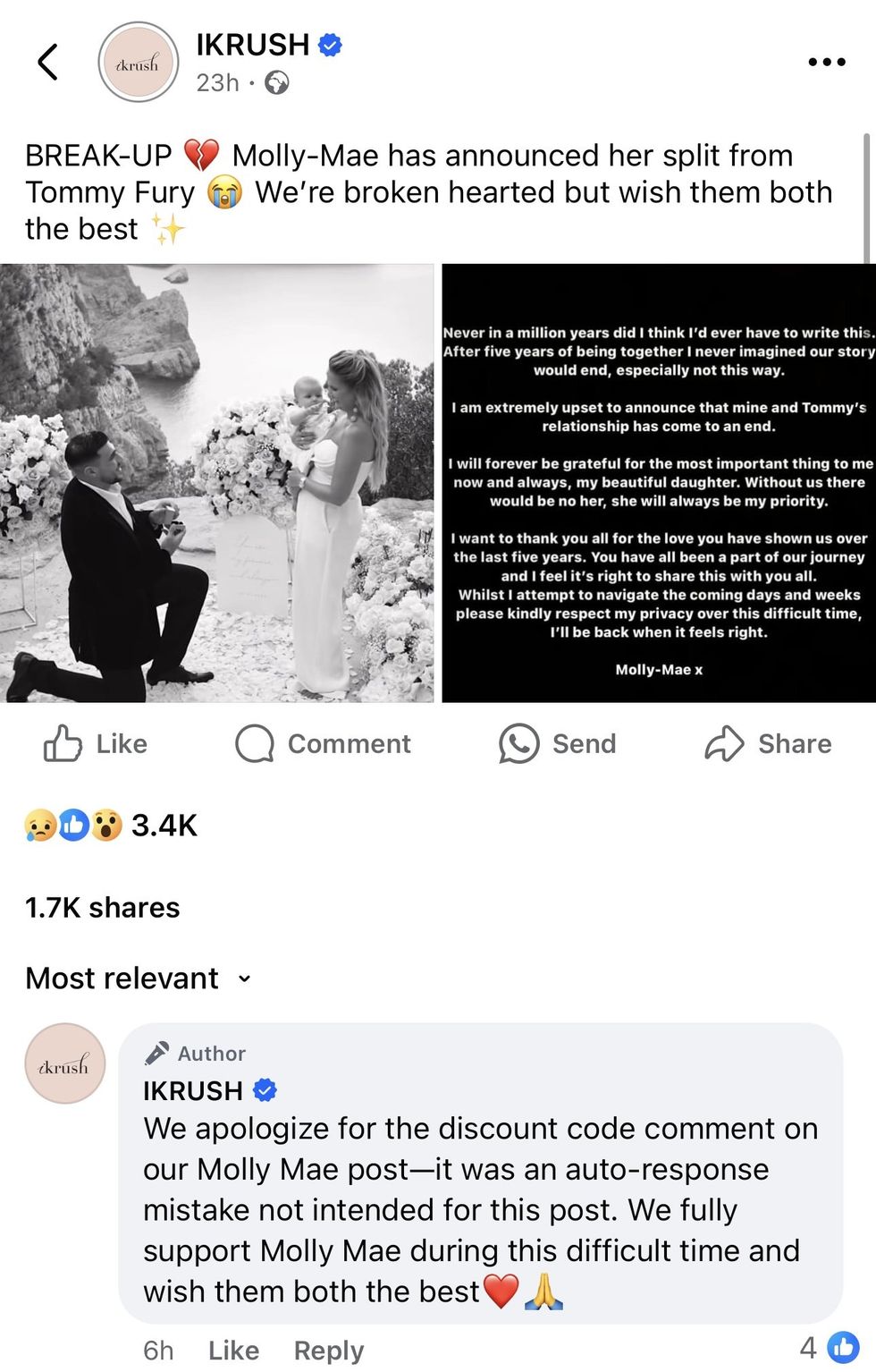 They later cleared up the confusion, writing: "We apologise for the discount code comment on our Molly Mae post – it was an auto-response mistake not intended for this post. We fully support Molly Mae during this difficult time and wish them both the best."