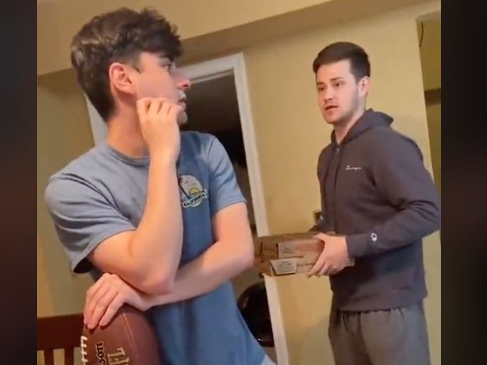 Then their housemate enters the room carrying a couple of takeaway boxes.