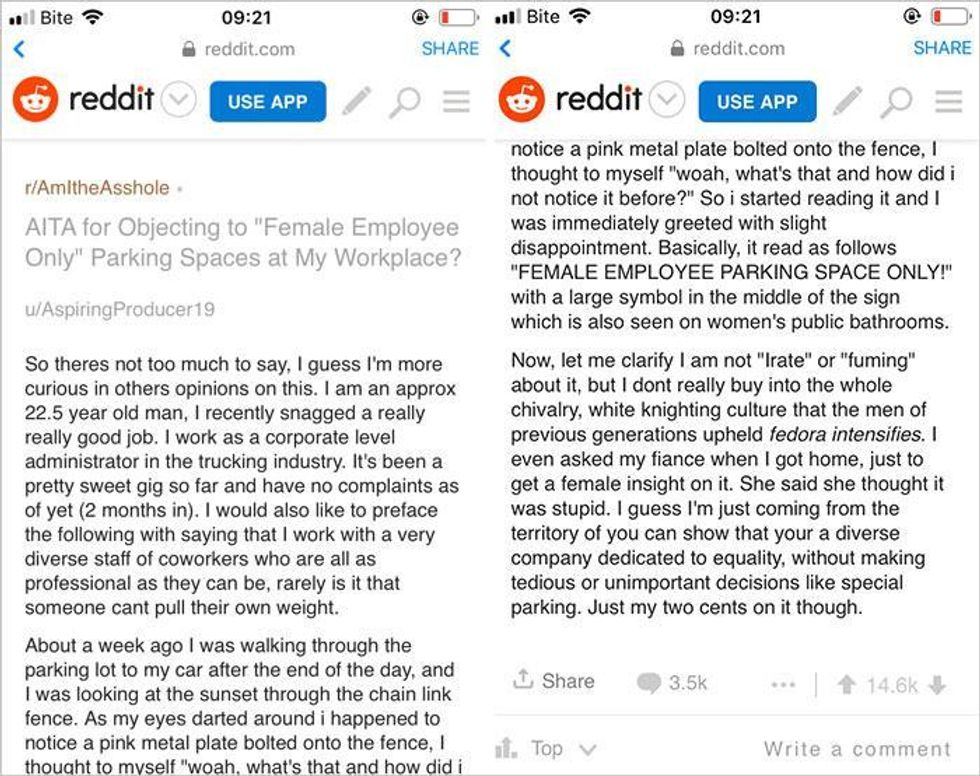 Recently, one Reddit has displayed this after asking the internet why women’s parking spaces exist. Yes, really. The user became irritated when coming across a sign in the parking lot that read: “Female employee parking space only!”