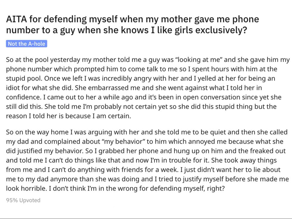 A teenage girl was left angry and frustrated after her mum gave her number to a boy despite knowing she was gay.