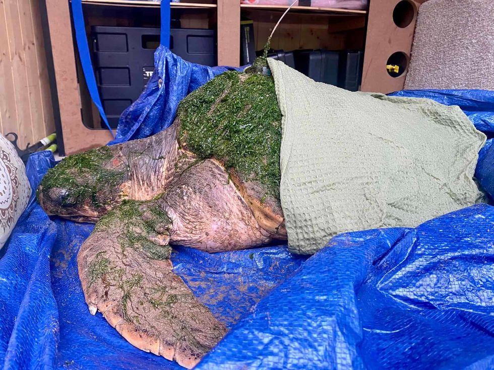 The creature was severely cold-stunned, suffering from pneumonia, and burdened with a thick build-up of algae and seaweed covering her shell upon her arrival at Sea Life Blackpool.