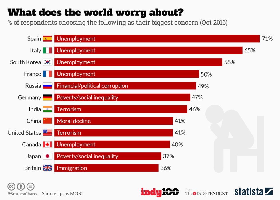 Many other countries around the world cited unemployment, terrorism, or economic reasons for dissatisfaction with the performance of the country.
