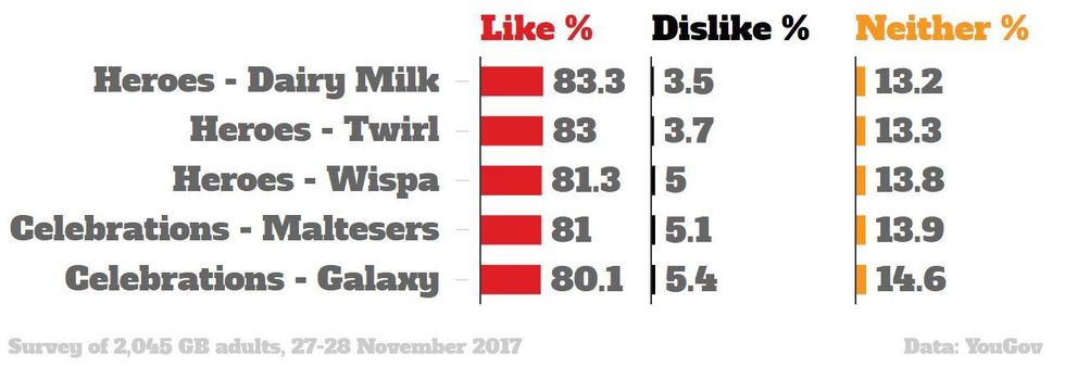 Here are the top five most disliked chocolates by net dislikes: Percentage is as of weighted sample size (Picture: indy100)