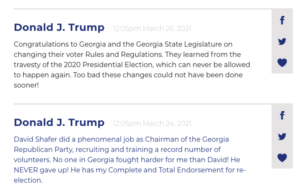 His first two posts on the page were in regards to Georgia. The first is Trump giving his approval to David Shafer, the chairman of the Georgia Republican Party. The second is slightly more controversial as he praises the controversial new voting laws in Georgia which have been labelled by critics as racist. This has lead to several major companies pulling out of Georgia in protest.