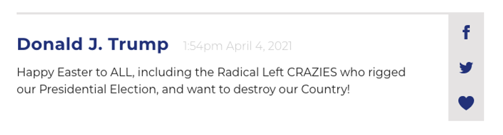On the 4th April, Trump wished everyone a Happy Easter including “Radical Left CRAZIES who rigged our presidential election and want to destroy our country!” How thoughtful of him.