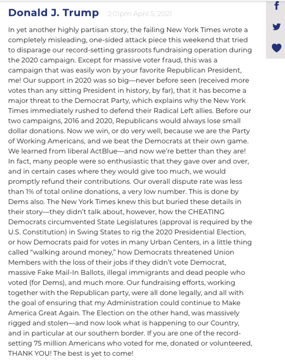 In a gigantic post on 5th April, he complains about a New York Times investigation into his team’s grassroots fundraising during the election and pushes further conspiracies about voter fraud.