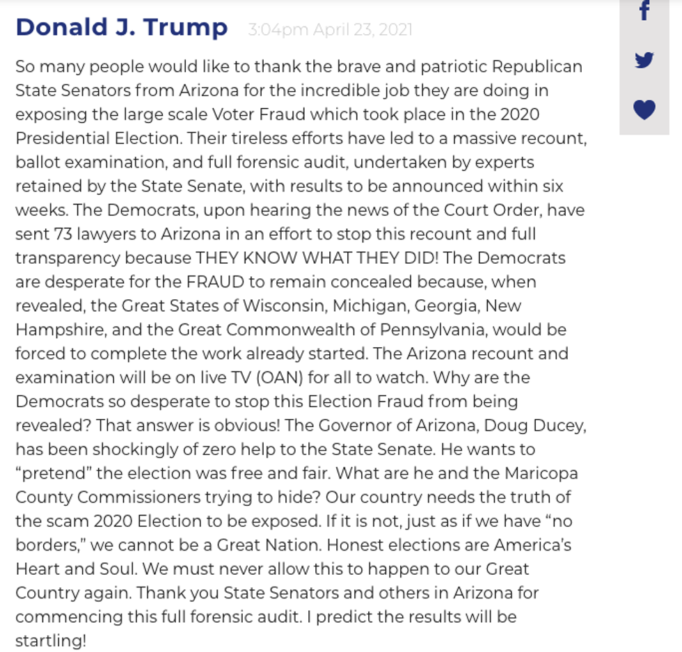 On to 23rd April and Trump goes on another rant about election fraud this time focusing on Arizona and calls for full transparency because “THEY KNOW WHAT THEY DID!”