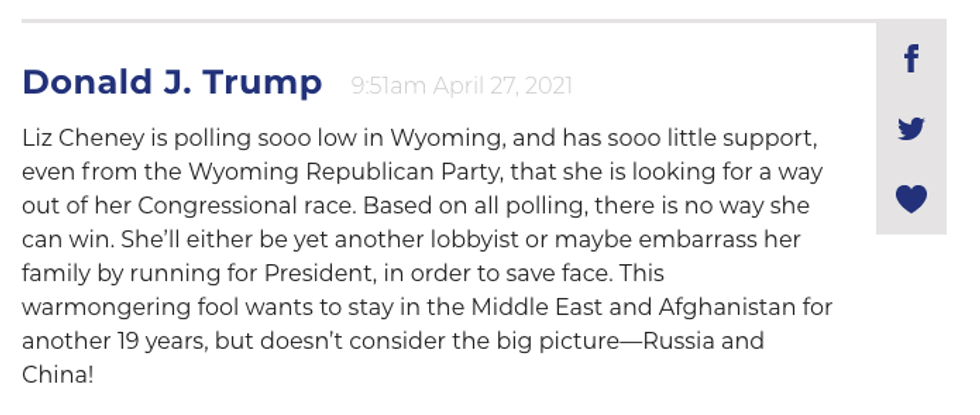 Finally, the most recent post which isn’t the aforementioned video is Trump again mocking Liz Cheney who he believes will never run in Wyoming again.