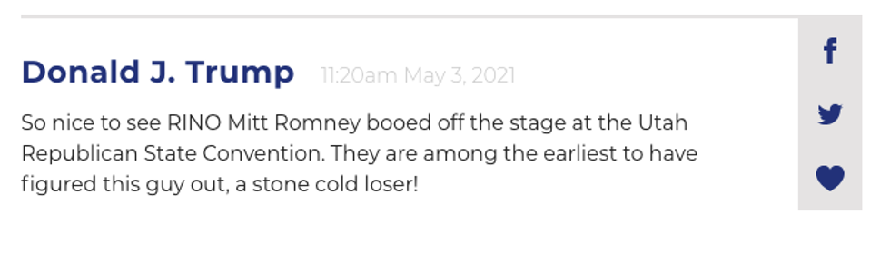 Into May and Trump pokes fun at Mitt Romney, who was booed by rabid Trump supporters at the Utah State Convention. Trump calls the former Republican presidential candidate and a critic of Trump, a “stone cold loser.”