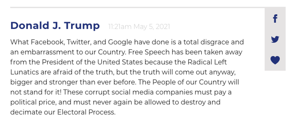 Trump returned to the blog almost immediately after it was announced that Facebook would not be revoking his ban and that he is still suspended from the website. He called them, Twitter and Google a “total disgrace” and that ‘free speech has been taken away from the president of the United States” (someone might wanna tell him he isn’t POTUS anymore). He added: “These corrupt social media companies must pay a political price, and must never again be allowed to destroy and decimate our Electoral Process.” Donald, if you wanna get back on these websites this might not be the best way to go about it.