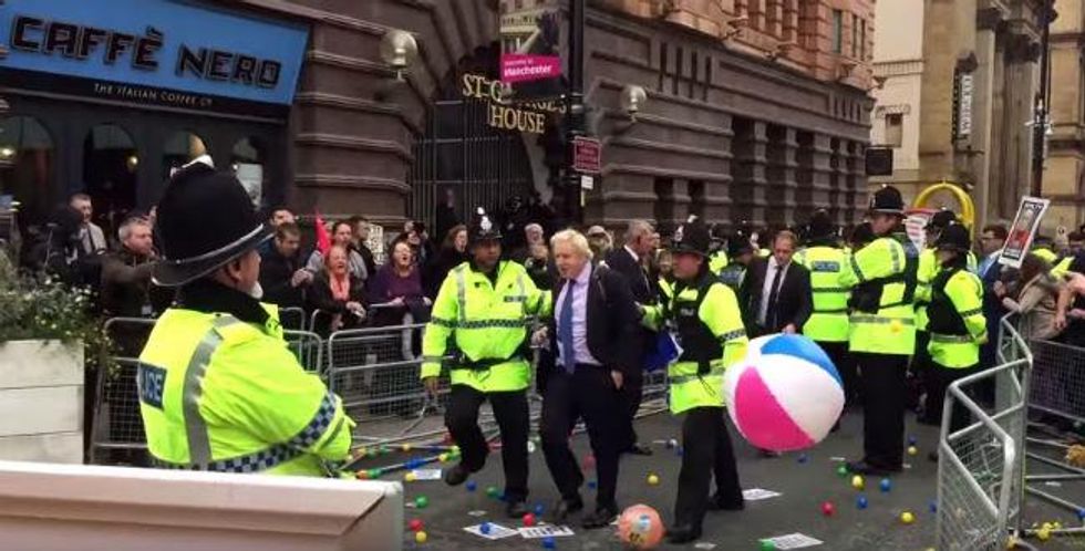 As well as a young Tory delegate (avec Union Jack pocket square and Margaret Thatcher-daubed Daily Telegraph) being egged, Boris Johnson had a series of inflatable balls thrown at him in anger (yes, really).