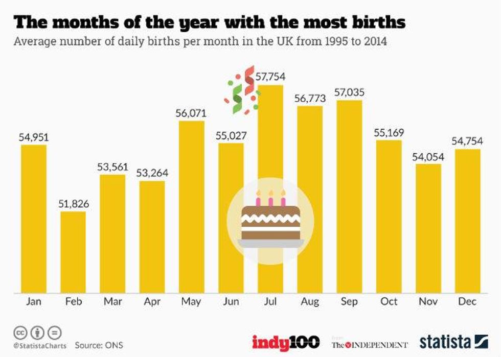 July is by far the most popular month for births, with 57,754 followed by September with just over 57,000 births. August comes third with 56,773.
