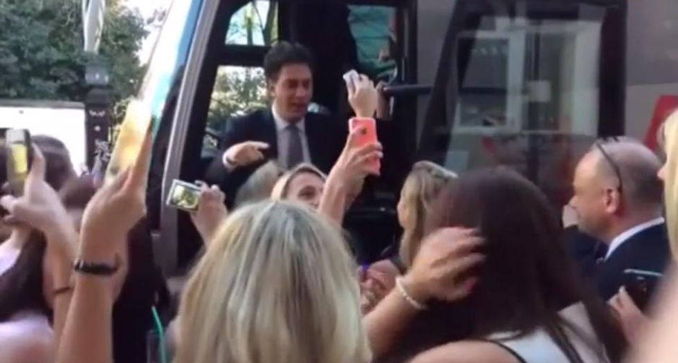 According to the Chester Chronicle, a hen spotted Miliband's battle bus outside the Westminster Hotel on Saturday when she was having a cigarette. The full group was told and after "some negotiations" with spin doctors, the bride was allowed on the bus for a picture with Ed. Then the man himself then appeared outside the bus for selfies with the group, prompting what we can only describe as a small frenzy. You can watch a video of the incident below: