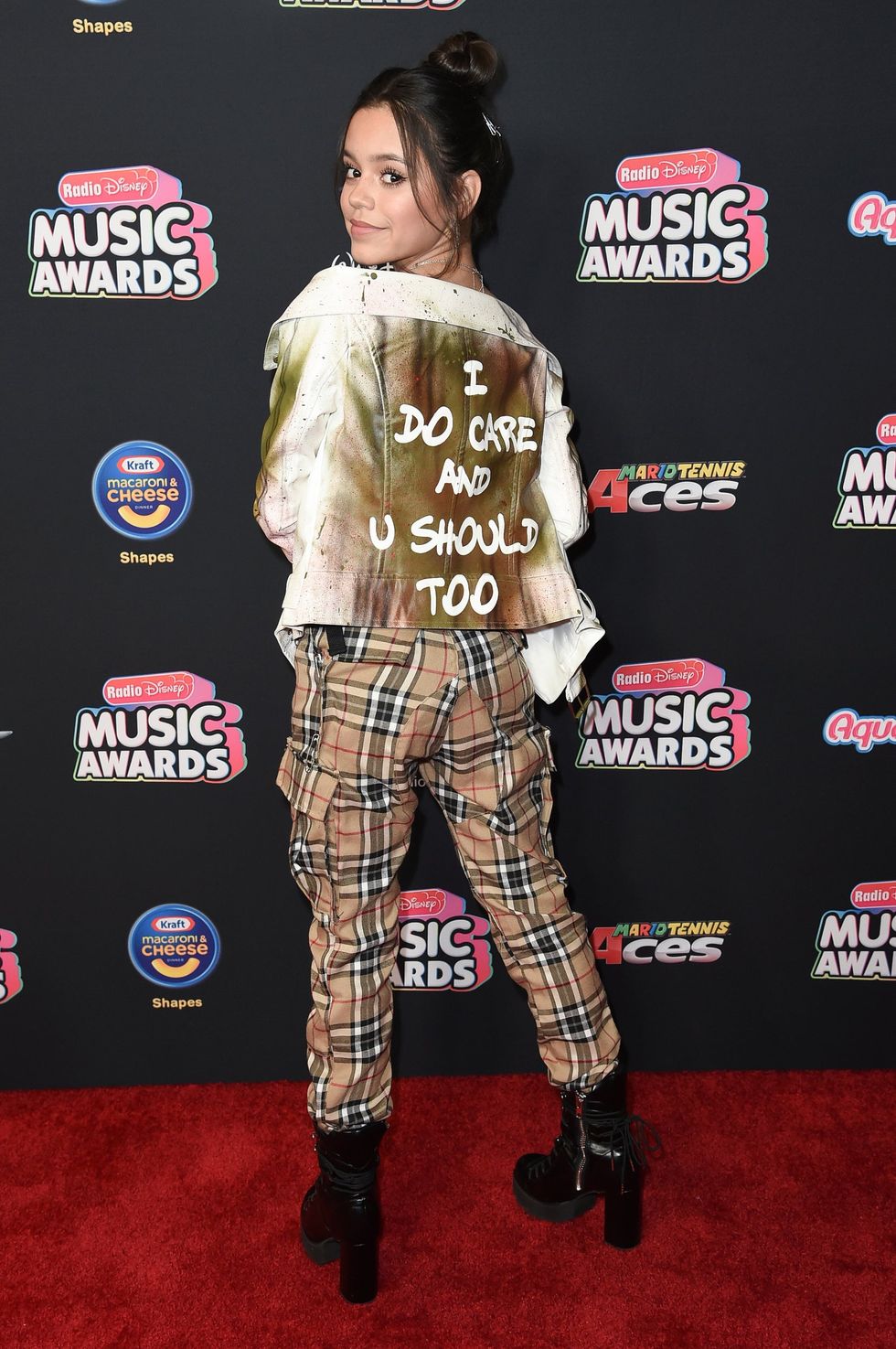 Disney actress Jenna Ortega created and wore a jacket with the words ‘I do care and you should too’ written on the back. The 15-year-old wore the article of clothing on the red carpet at the Radio Disney Music Awards on Friday.