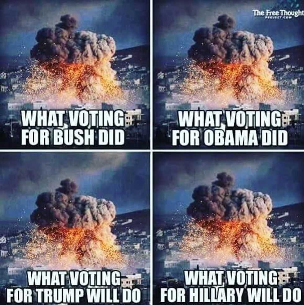 The meme, which was shared on Facebook with the accompanying #VoteThirdParty shows that one reason people are drifting away from the traditional parties is because of the wars - including Iraq, Afghanistan, Syria - that the US have been embroiled in over the years.