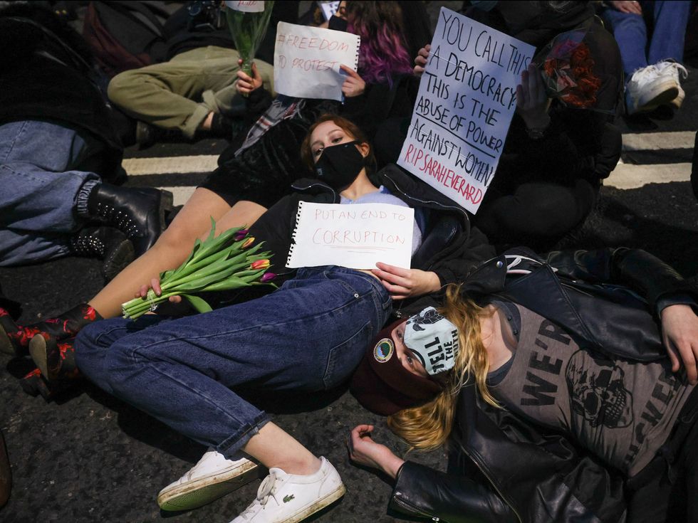 Women lie on the ground as part of a "die-in" during action outside Scotland Yard. This action is often taken to symbolise that an organisation being protested against – in this case the Metropolitan Police – is contributing to people’s deaths. The force has been sharply criticised for its handling of Saturday’s vigil, and for not always offering adequate attention to complaints of harassment.
