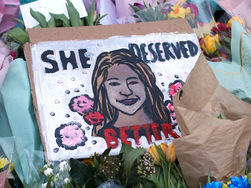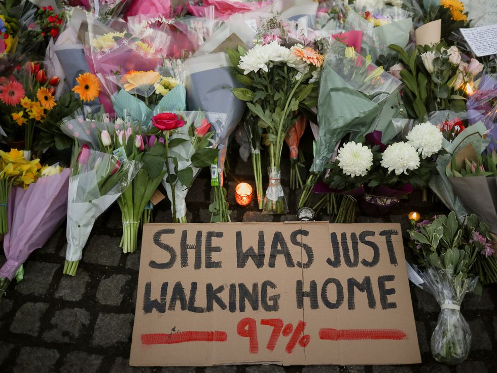 Amid the flowers is yet another reminder that Sarah wasn’t doing anything irresponsible or ostenisibly dangerous on the night of her murder: she was simply heading home. The figure written in red underneath refers to a statistic published by UN Women UK, which found that 97 per cent of women aged 18 to 24 have been sexually harassed.