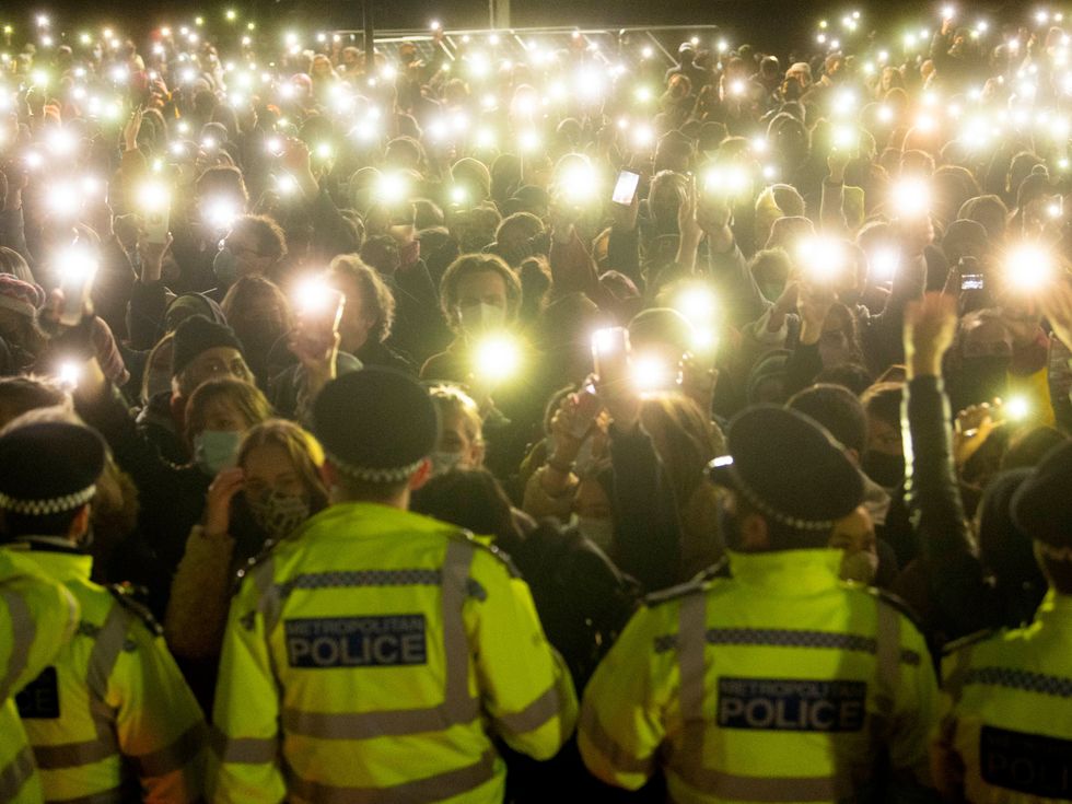 This striking image shows the sea of mourners and vigil attendees in Clapham Common using their phone lights as torches. The police stand guard but, in the foreground, a raised fist can be seen in a mark of strength and defiance.