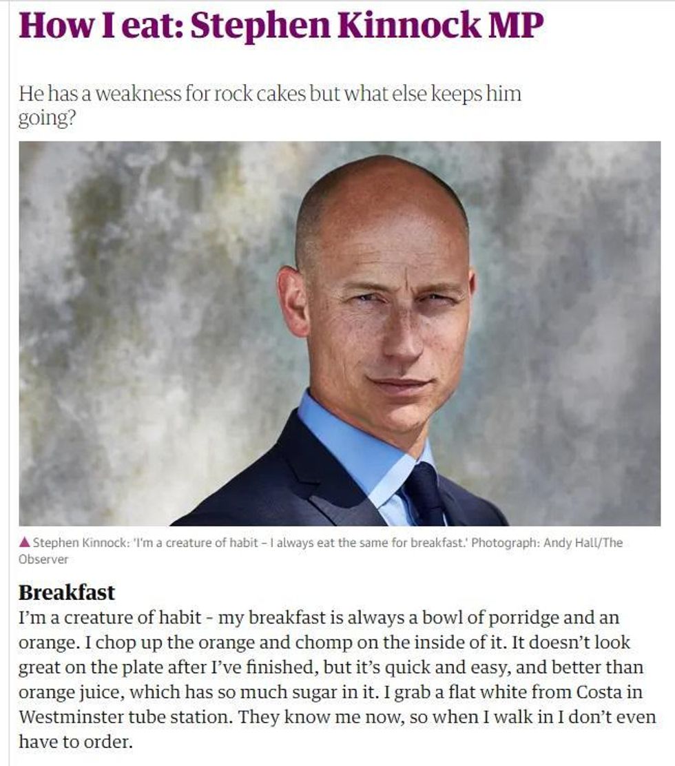 He wrote in The Guardian’s “How I eat” column last June that the first thing he does in the morning is “grab a flat white from Costa in Westminster tube station. They know me now, so when I walk in I don’t even have to order.”