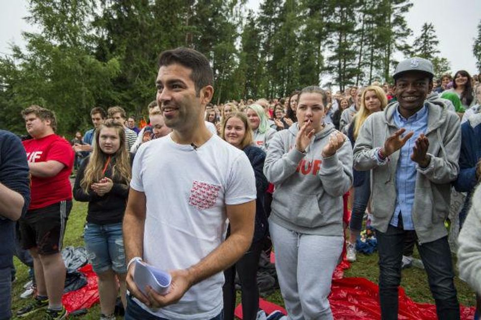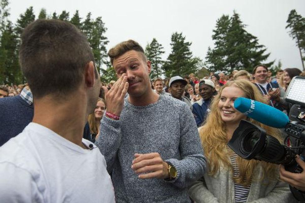 Eskil Pedersen, the former leader of the party's youth wing who survived the 2011 attack, wiped away tears while talking to the new members.