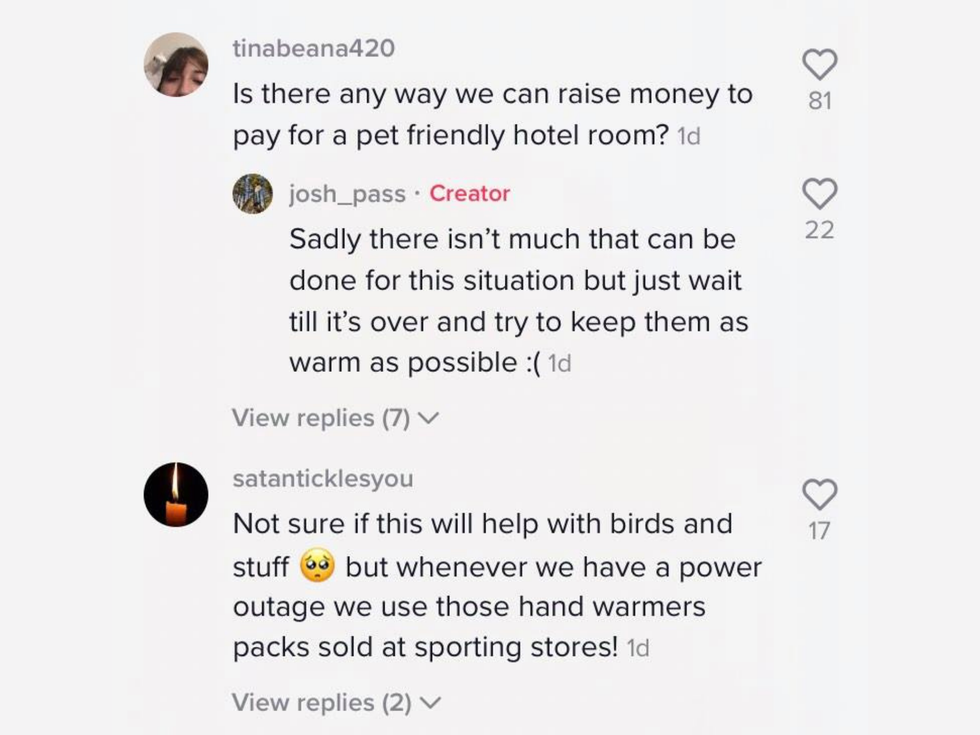 A popular figure in the #birdsoftiktok community, Josué often posts about the wholesome adventures of his birds. In the video, Josué explains how cold is severely impacting the wellbeing of his animals to the point where the warmest place to sleep with them is his car.