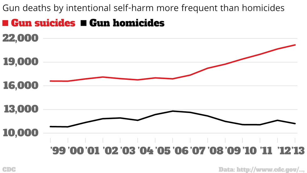 In 2013 alone, guns caused 21,175 deaths by intentional self harm in the US, compared to 11,208 homicides.
