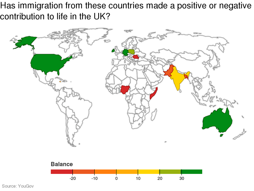 Respondents in the same survey the charts are based on were asked whether immigrants from a selection of countries had made a positive or negative impact upon the UK. The results are mapped below.
