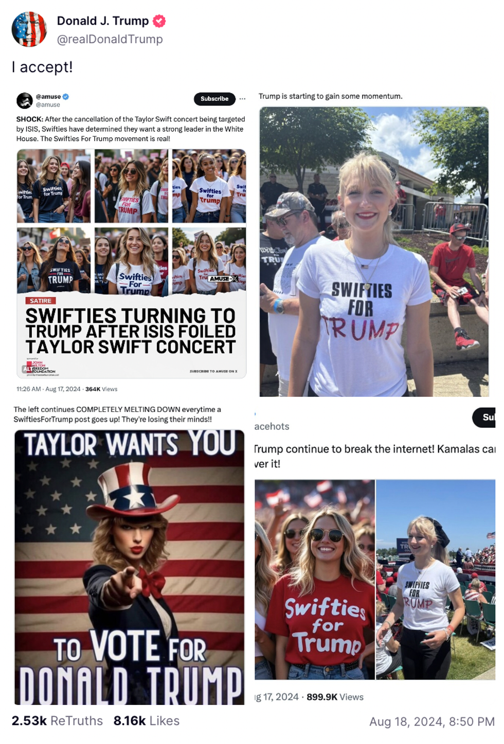 Donald Trump has seemingly turned to artificial intelligence to suggest Taylor Swift fans are supporters of his, a day before Kamala Harris' Democratic National Convention and many of her fans are encouraging the singer to take legal action.