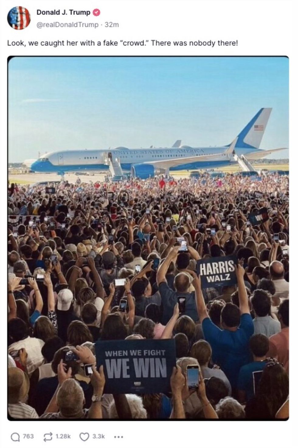 The photo Trump is referring to is of Harris as she stepped out of Air Force Two with a large crowd on the tarmac welcoming her to the campaign rally in Michigan.
