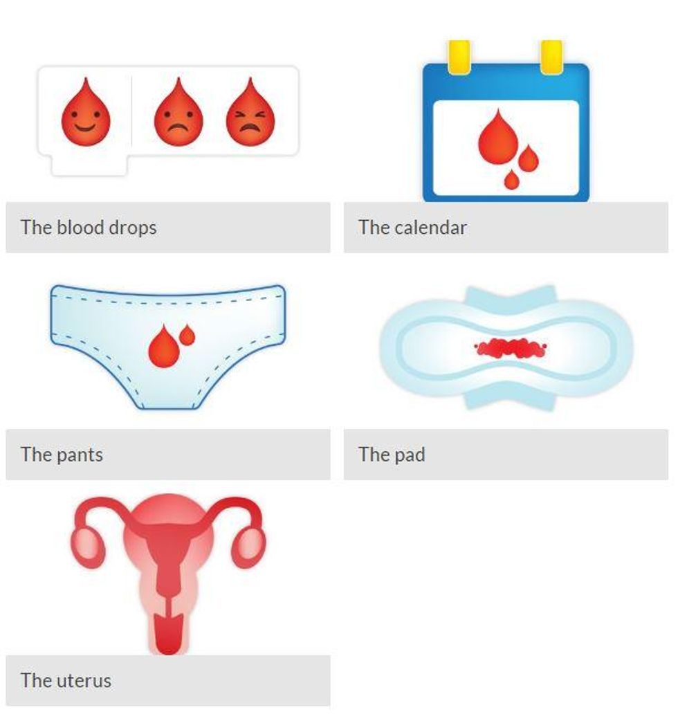 People can choose between a used sanitary towel, a diagram of a uterus, period pants, a calendar representing ‘that time of the month’ or blood droplets.