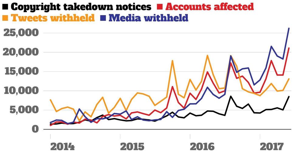 Twitter will respond to reports of alleged copyright infringement, such as allegations concerning the unauthorised use of a copyrighted image as a profile or header photo, allegations concerning the unauthorised use of a copyrighted video or image uploaded through our media hosting services, or Tweets containing links to allegedly infringing materials.