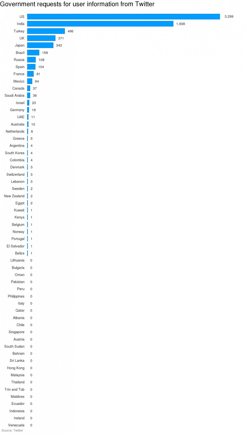 Data requests from Turkey increased greatly over the six months to 496, making it the third placed country on the list behind India with 1,938. Twitter said it complied with none of Turkey's requests but 22 per cent of India's.