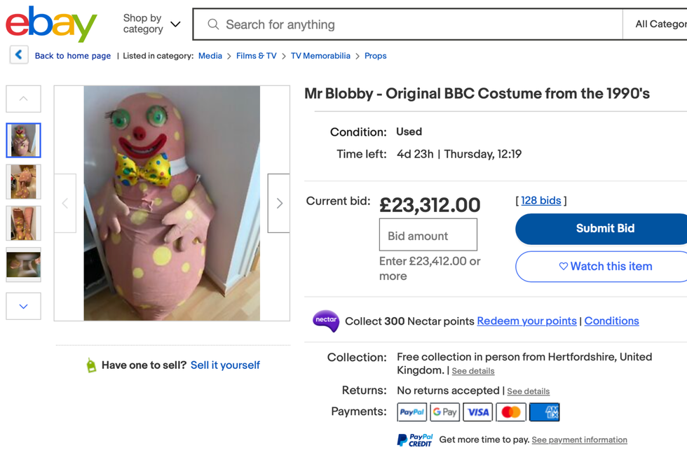 According to eBay’s bidding history, there’s been 128 bids on the Mr Blobby (with 59 bidders and four retracted bids), and the starting price on Monday was a far more affordable £39.