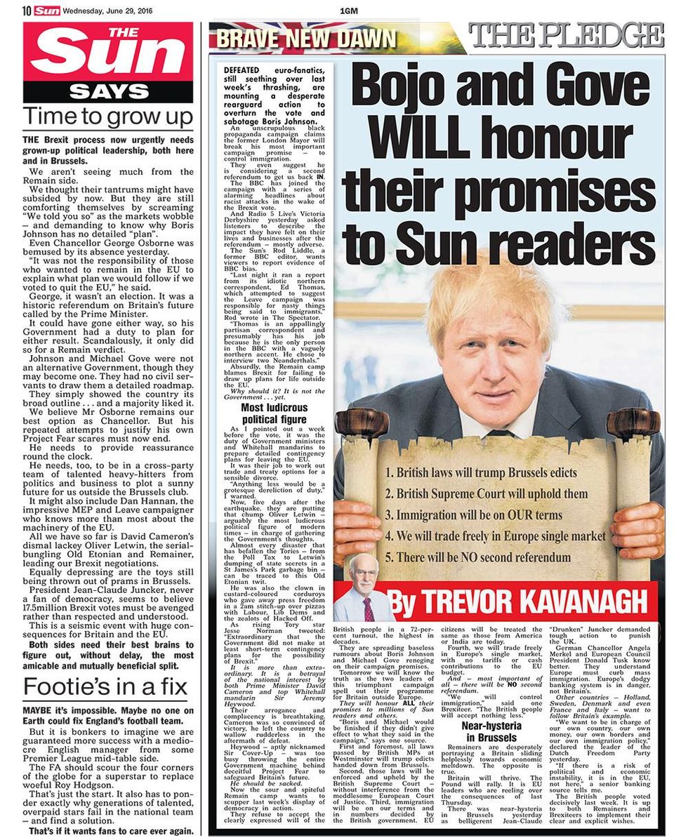 The Sun has called on Johnson and fellow Leave campaigner Michael Gove to honour promises made before the Brexit vote - which the newspaper backed firmly.