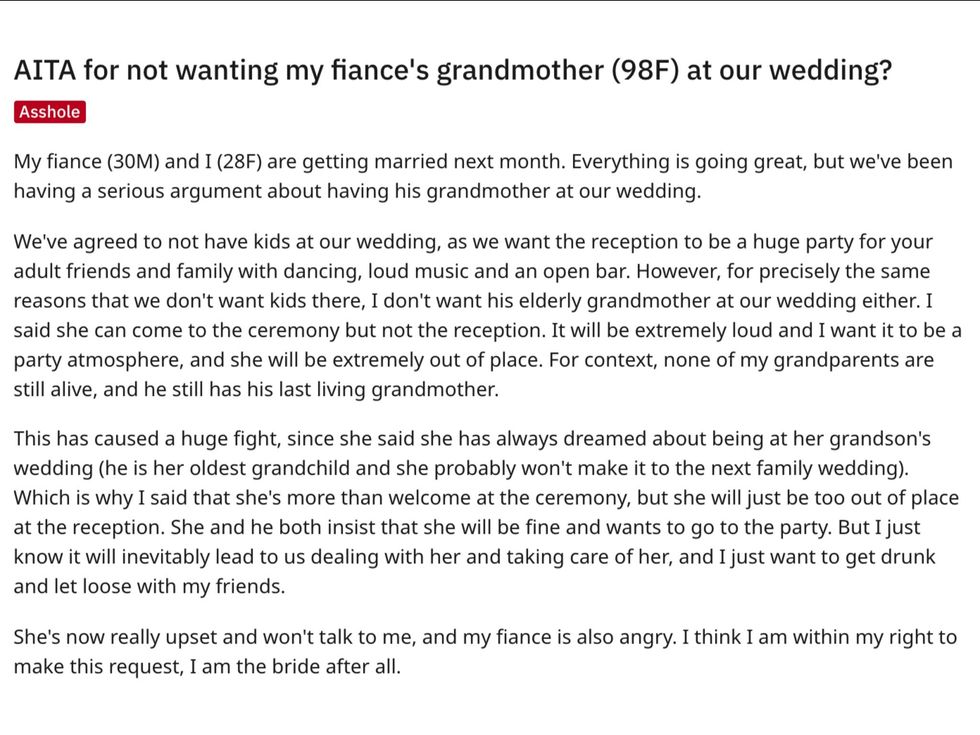 “For precisely the same reasons that we don’t want kids there, I don’t want his elderly grandmother at our wedding either,” she continued, adding that she was willing to let the 98-year-old attend the ceremony, just not the reception.