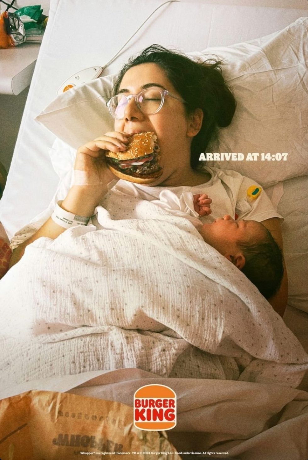 The famous fast-food joint shared the new 'Bundles of Joy' campaign last week, featuring real images and recordings of mothers enjoying a Whopper post-birth. The images also included the time of arrival.