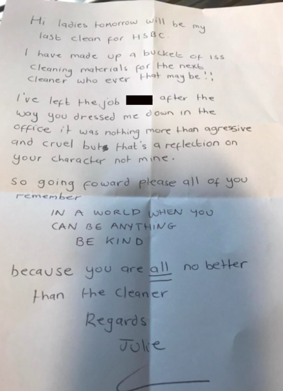 She wrote: “Hi Ladies, tomorrow will be my last clean for HSBC. I have made up a bucket of ISS cleaning materials for the next clear whoever that may be!!”