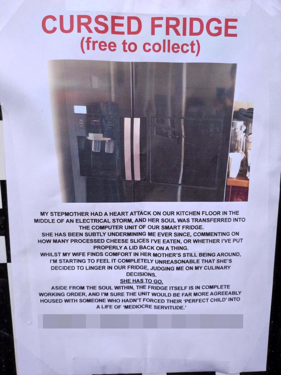 A spooked homeowner is giving away a "cursed fridge" haunted by the soul of their stepmother.
