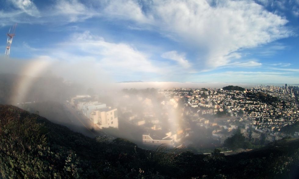 White rainbows - like this one in San Francisco - are formed from fog, rather than rain. Because the size of water droplets that cause fog are smaller than rain, a "fogbow" appears to be white.