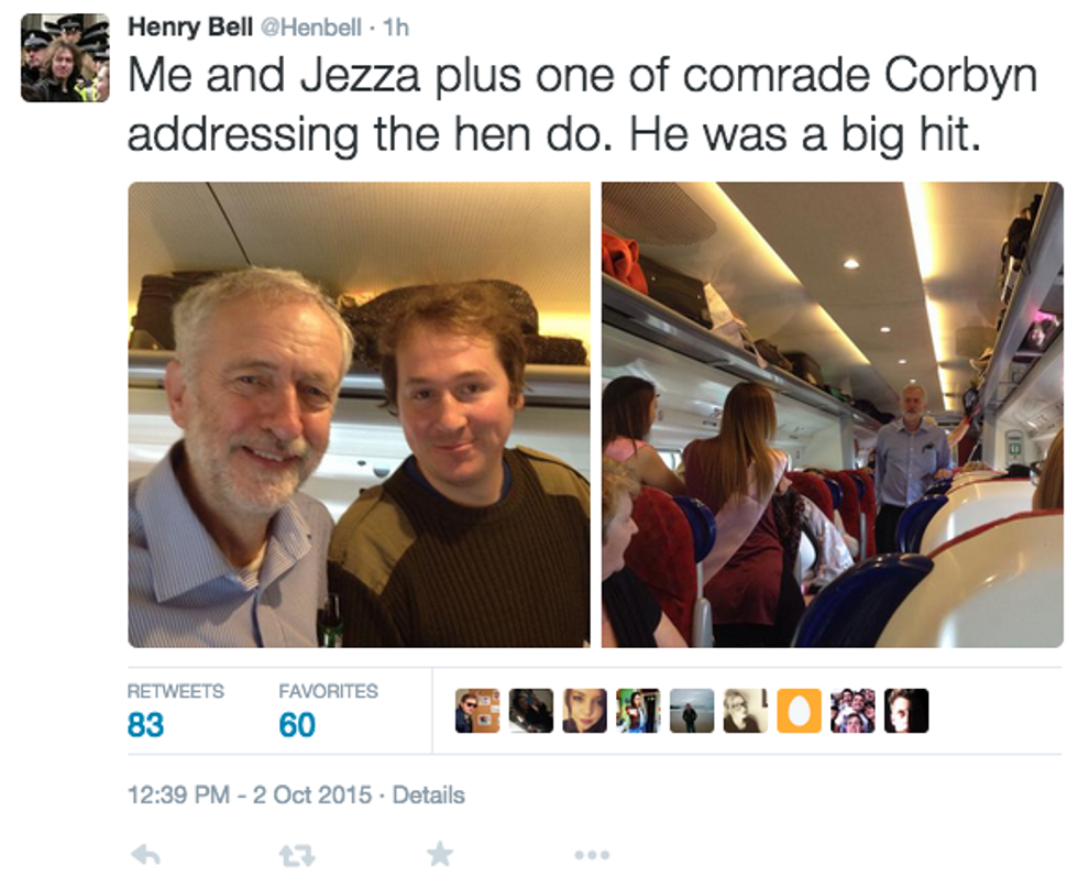 Henry Bell, a journalist who witnessed the encounter, said Corbyn proved to be "a big hit" with the group of women, at least one of them clad in a pink sash, on a train in Scotland.