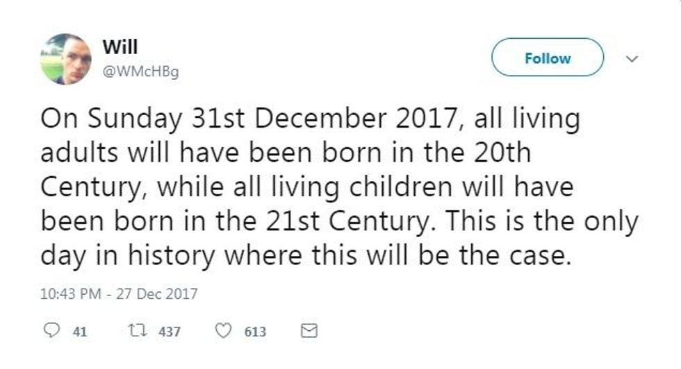 So that does indeed mean that on 31 December 2017 - for one day only - every living adult on the planet will have been born in the 20th century, while everyone born thereafter - in the 21st century - will still technically be a child.