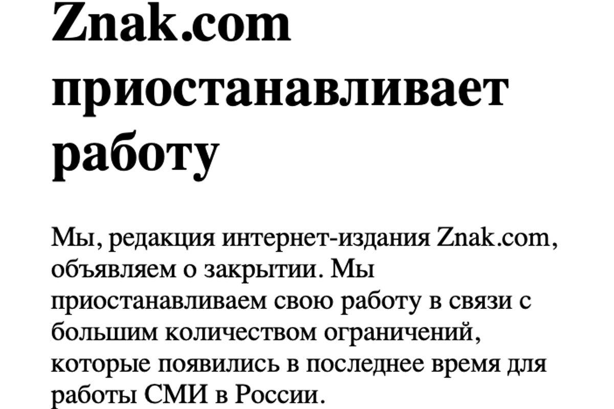 All that's remaining on the homepage is a notice that reads: "We, the editors of the online publication Znak.com, announce the closure. We are suspending our work due to a large number of restrictions that have recently appeared for the work of the media in Russia."