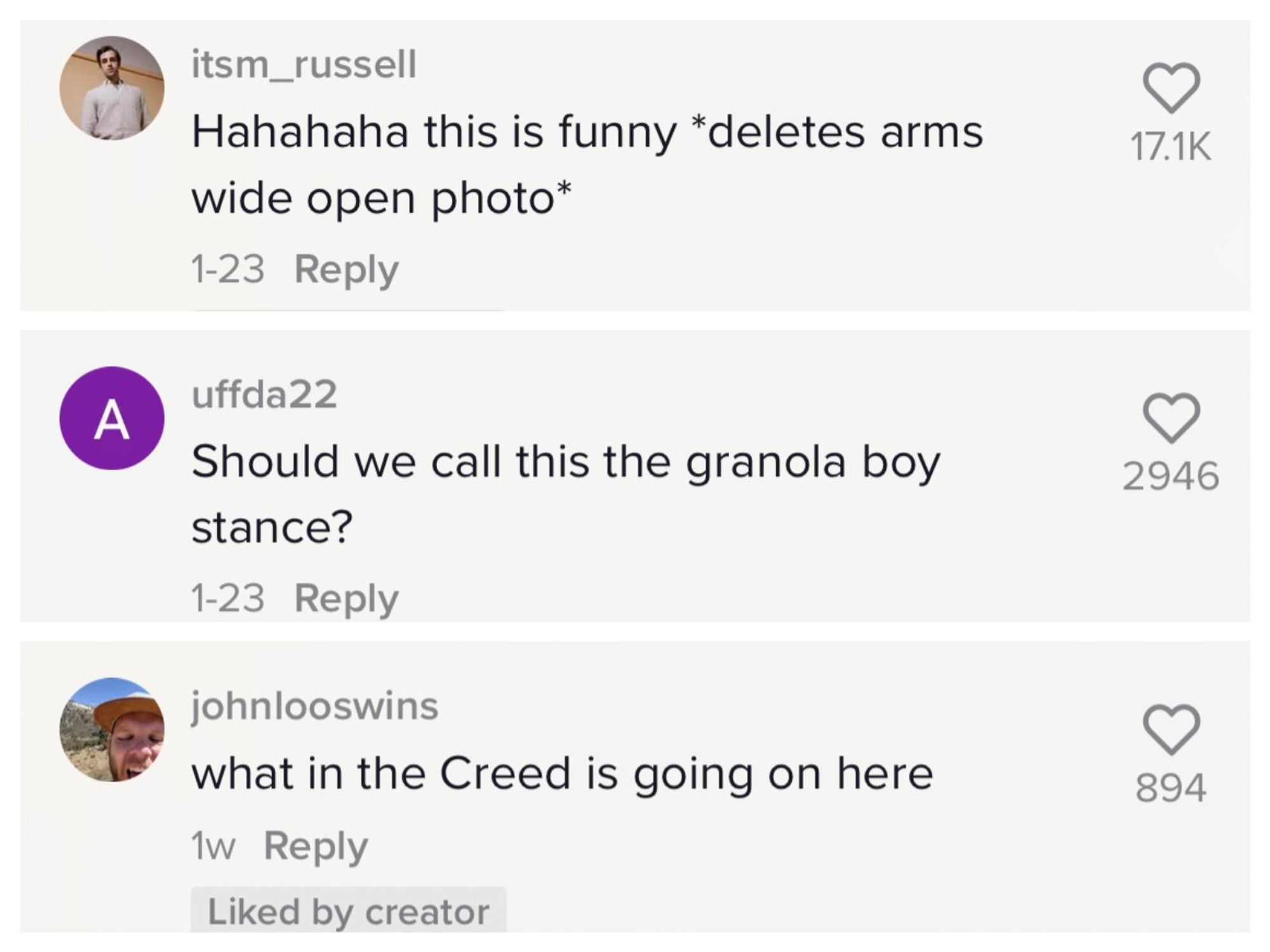 Other users had fun with Minnie's observation, one user named the pose, another referenced the song With Arms Wide Open by the band Creed.