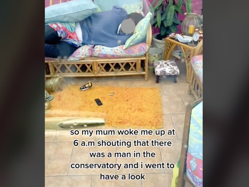In a viral TikTok, the woman, who calls herself Tasha, reveals how she was woken up by her mum at 6am after she found a man who’d made himself at home on their conservatory sofa.