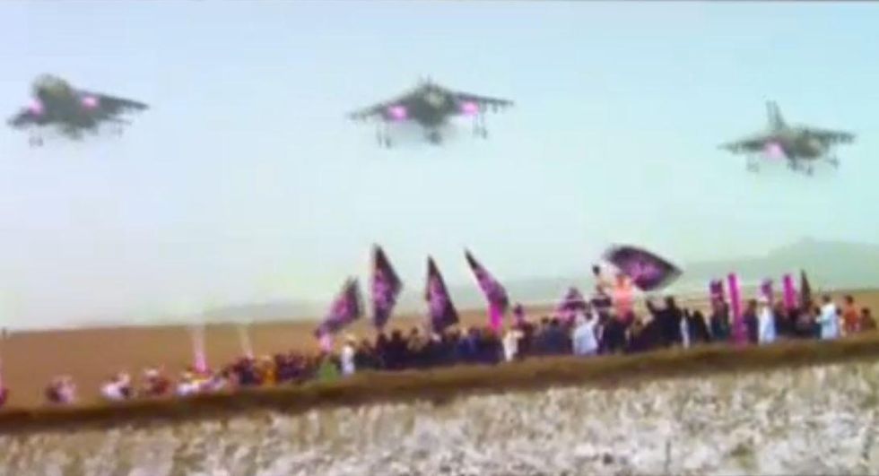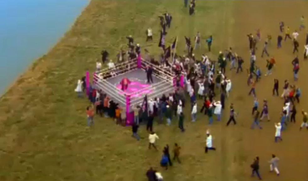 It ends on the White Cliffs of Dover, with Harrier Jump Jets over head, as Gardner stands in a boxing ring and bellows: