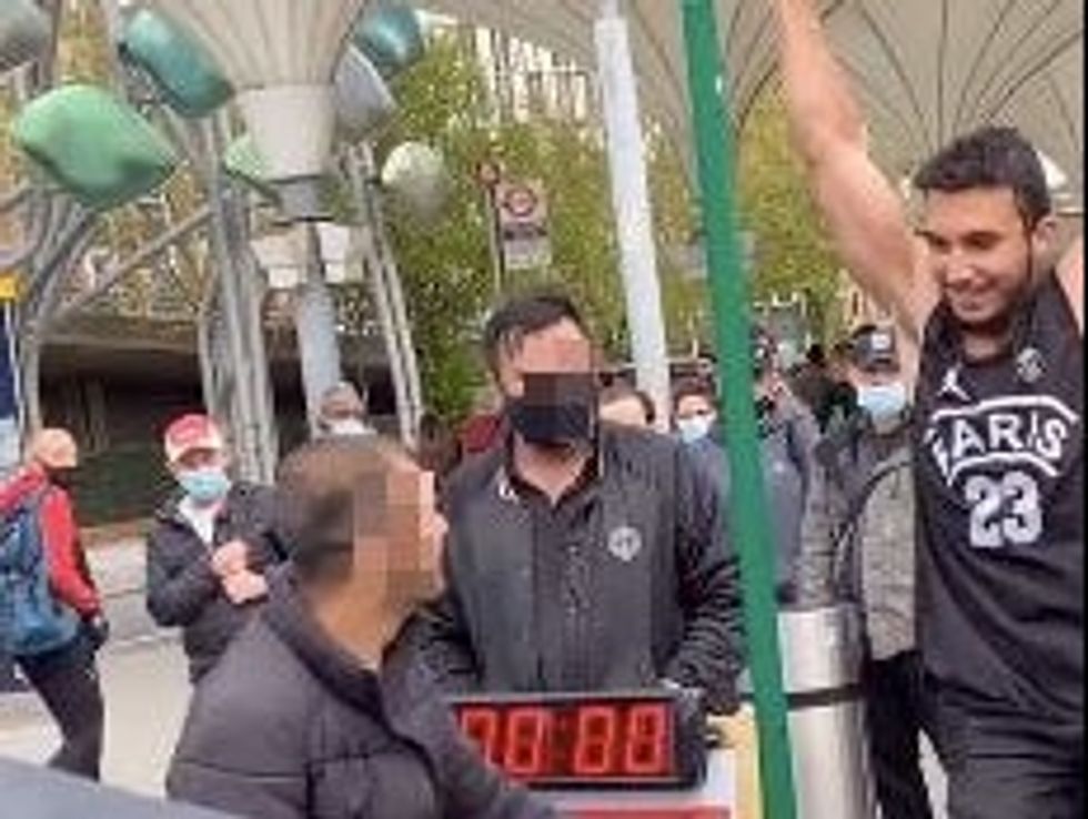 A man who was on track to successfully complete a street challenge to dangle 100 seconds from a metal bar to win £100 was left furious - after the people leading the contest scammed him out of his earnings by tickling him and yanking at his body.