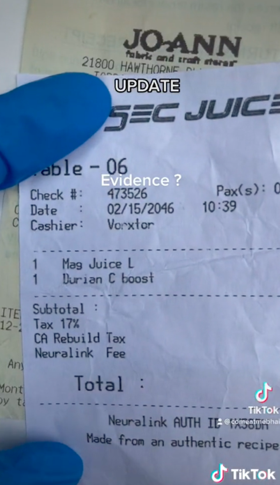 The second video on the account then claims to show ‘evidence’ and presents to the camera several receipts that have dates on them from the year 2046. One of the receipts makes reference to Neuralink, Elon Musk’s ‘brain chip’ start-up company.