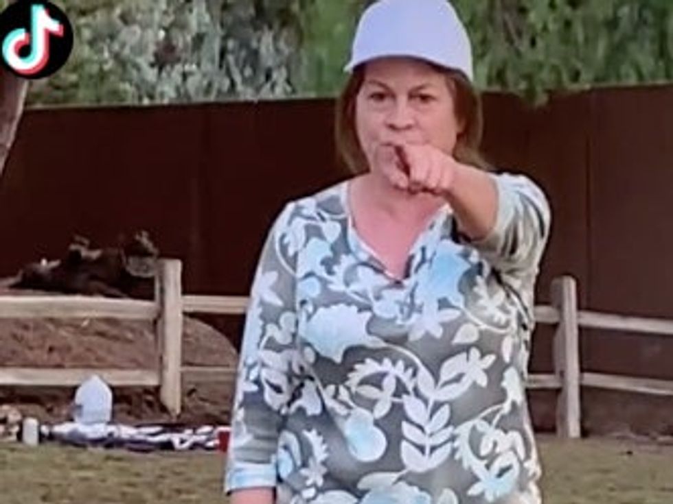 Shot by the user _numlock, the video shows a white woman walking her dog and gesturing to a family of five, who are clearly walking away from her while she appears to be talking at them.